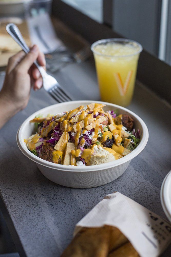 Falafel, roasted veggies, hummus, Crazy Feta®, pickled onions, pita crisps, lentils, rice, greens, skhug, more