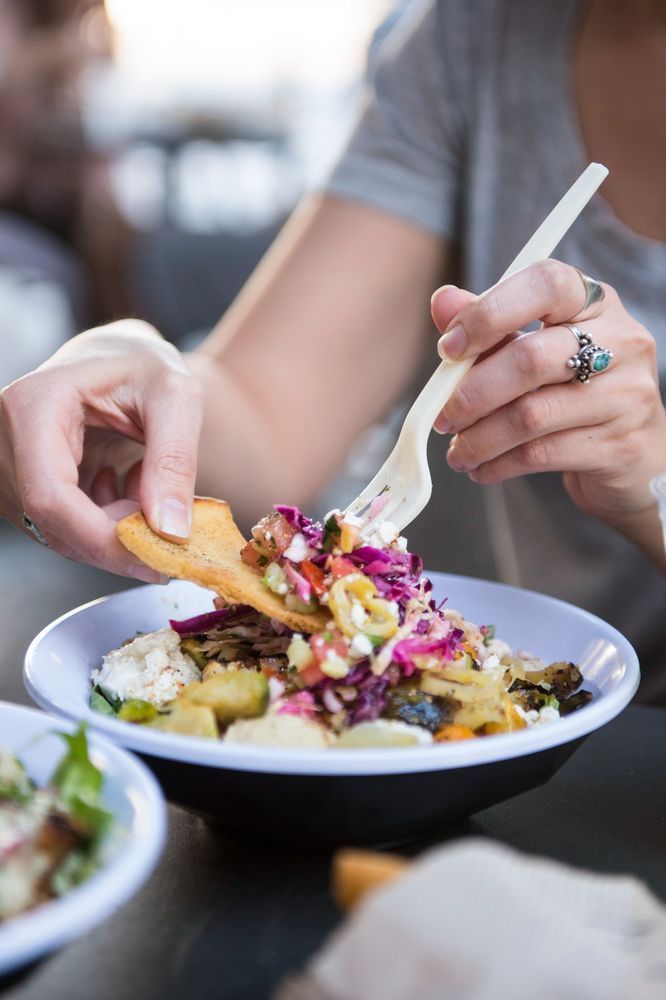 Falafel, hummus, roasted eggplant, pickles, cabbage slaw, tomato + onion, garlic dressing, skhug.